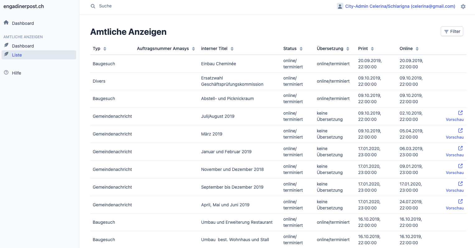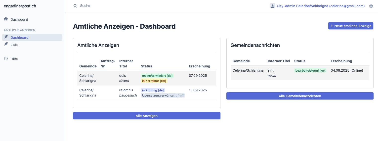 Bei beiden Bereichen, «Amtliche Anzeigen» und «Gemeindenachrichten», werden die aktuellsten Einträge aufgelistet. Um sofort einen neuen Eintrag zu erfassen, wählt man «Neue amtliche Anzeige» (1).