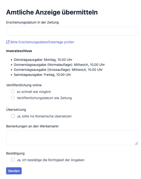 Zur Veröffentlichung wählen Sie die Schaltfläche «Veröffentlichen» (1). Im folgenden Dialog wählen Sie die gewünschten Erscheinungsdaten (2), wann Sie die Anzeige gerne Online veröffentlichen möchten (3), ob Sie noch eine Übersetzung (4) wünschen und ob die Angaben korrekt sind (5). Falls Sie bereits selber eine Übersetzung erstellt haben, erscheint die Auswahl zur übersetzung nicht. Im Textfeld können Sie noch Hinweise und Bemerkungen für den Werbemarkt hinterlegen. Bestätigen Sie die Veröffentlichung mit einem Klick auf «Senden». Sobald der Werbemarkt die Anzeige geprüft hat, erhalten Sie ein Bestätigungsmail.