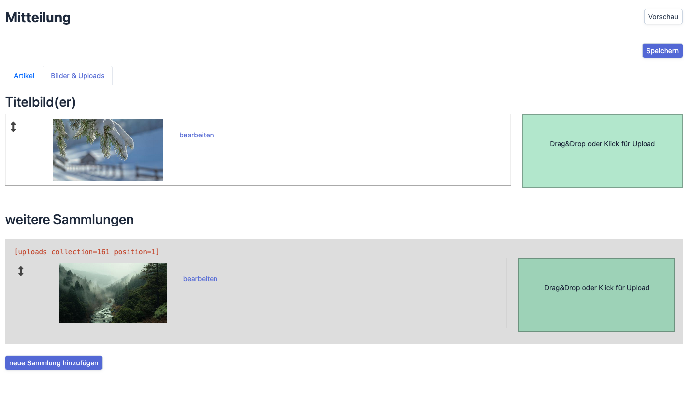Verwenden Sie den Schnippsel (Shortcode) um die Bilder-Sammlung an beliebiger Stelle in den Mitteilungstext einzufügen.