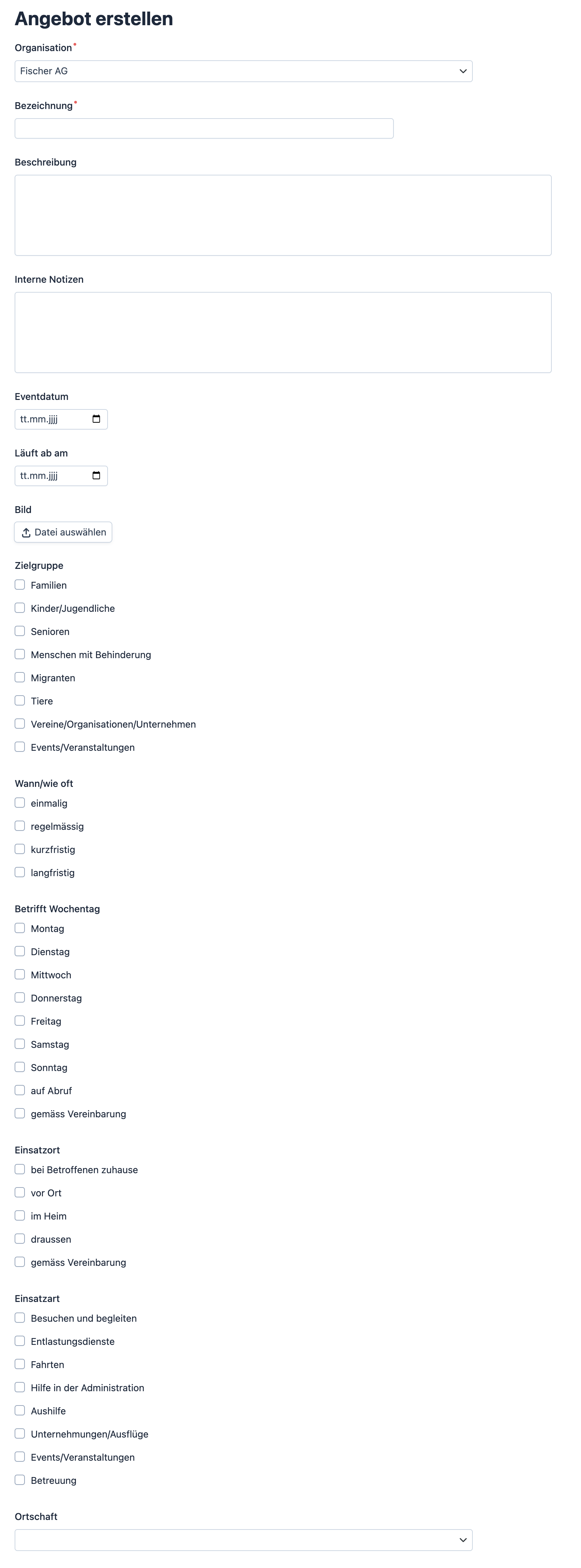 Angebote werden möglichst detailliert erstellt, damit die User genau wissen, was sie erwartet. Die Felder wie "Zielgruppe" etc. entsprechen denselben Kriterien wie bei den User-Profilen. So können die User gezielt nach Angeboten suchen, die ihren Interessen und Fähigkeiten entsprechen.