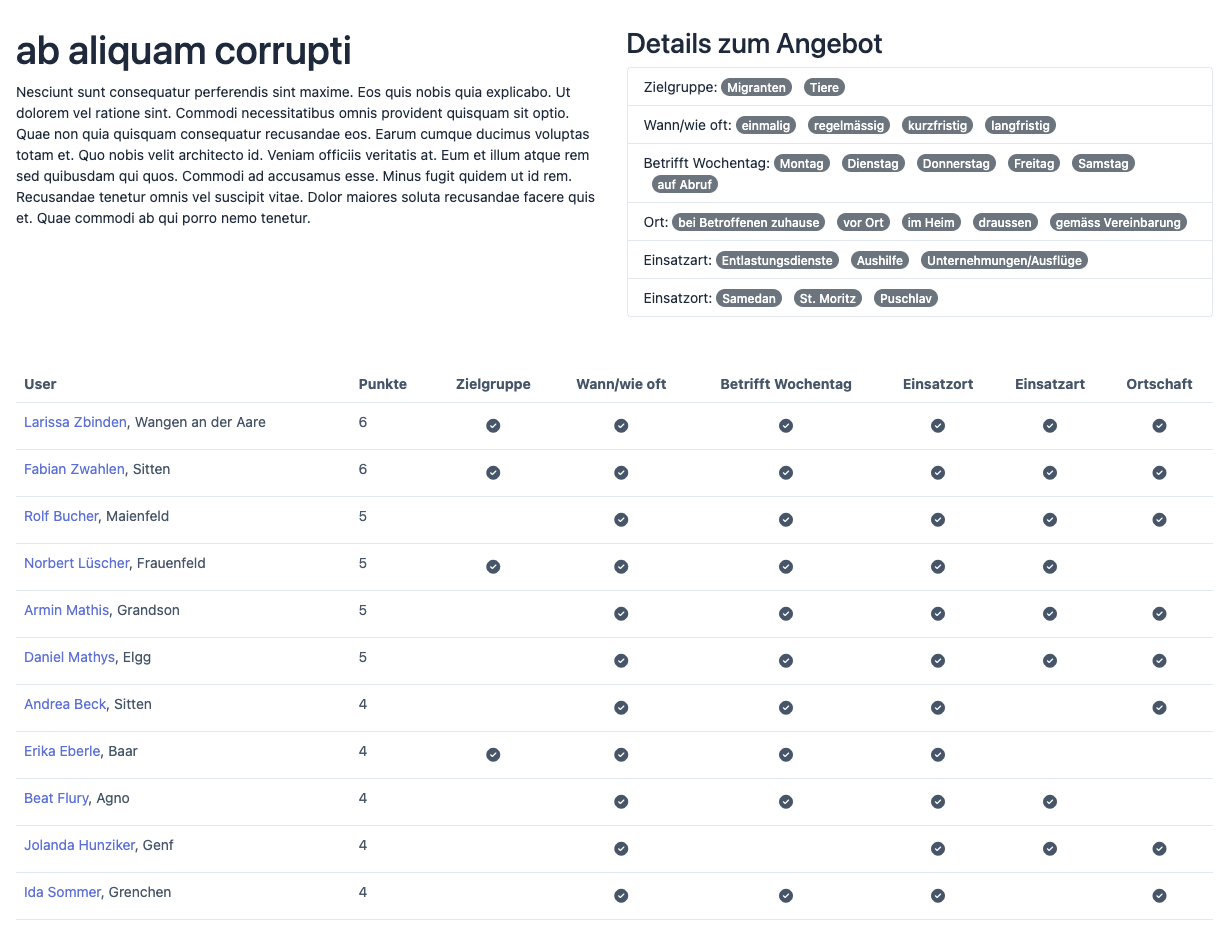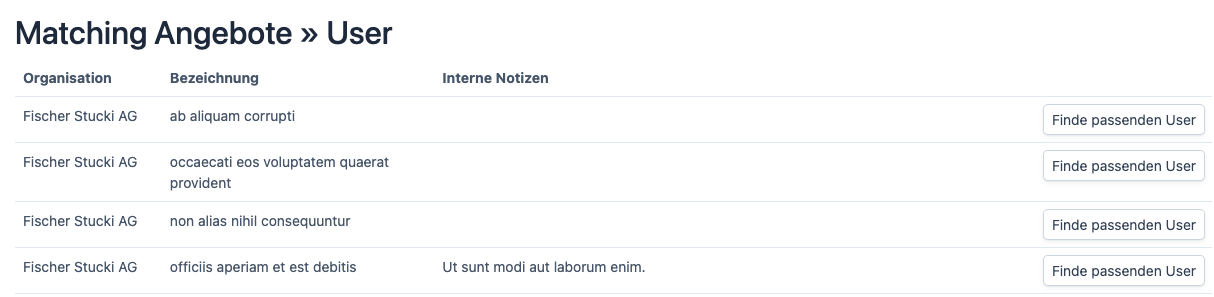 - Alle Angebote werden aufgelistet. Beim gewünschten Angebot auf die Schaltfläche «Finde passenden User» klicken