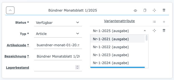 910Typ auf «Article» setzen (11) Artikelcode des Produkts plus die Grösse/Farbe angeben (12) Anzahl Produkte mit der Grösse auf Lager angeben (13) Auf das Plus klicken (14) Entsprechenden Variante zuweisen (15)