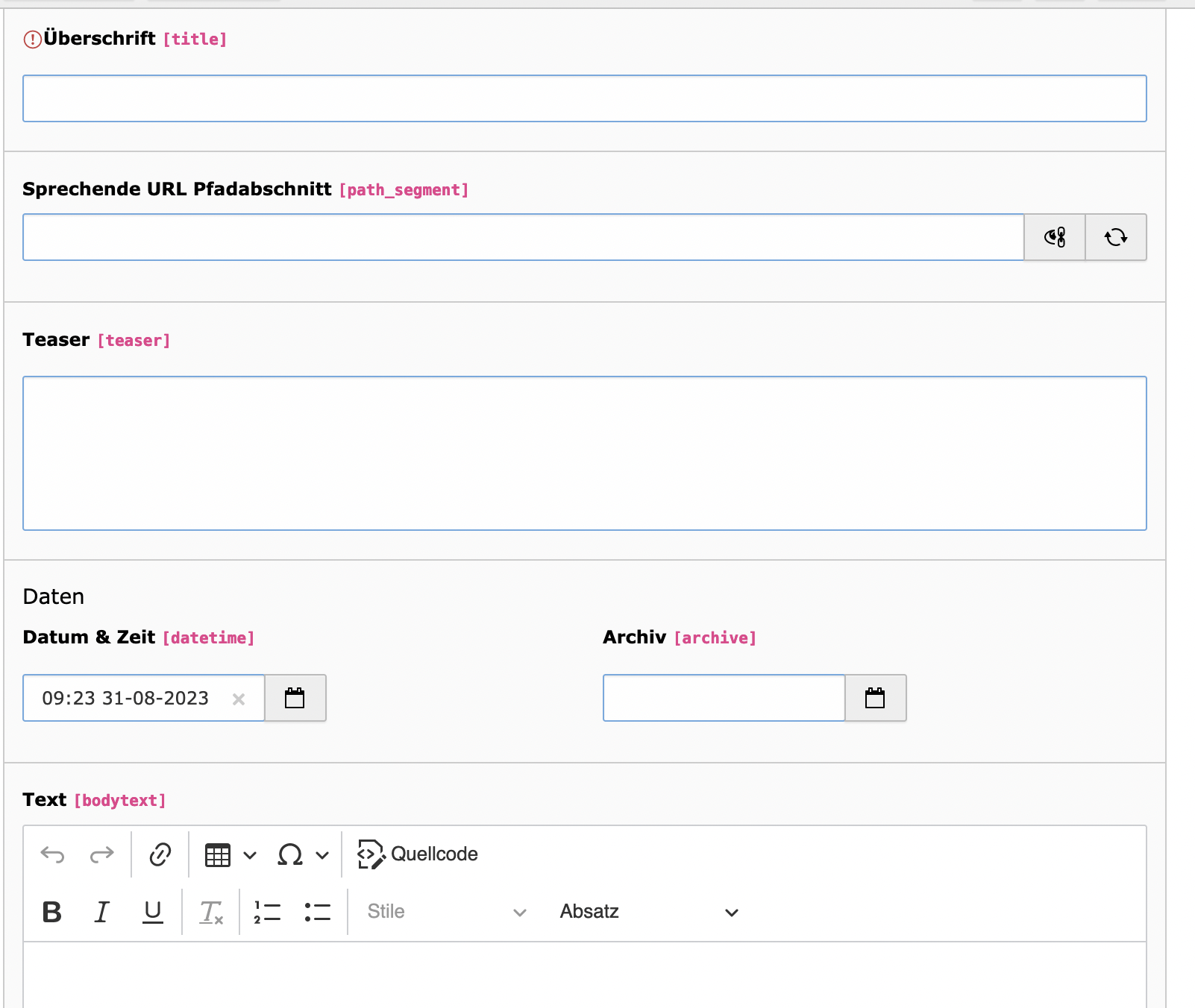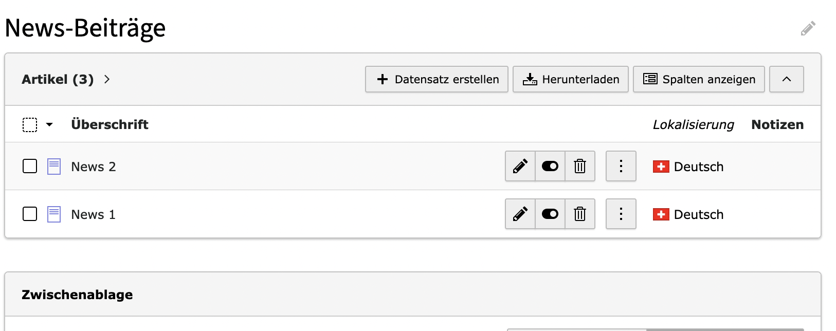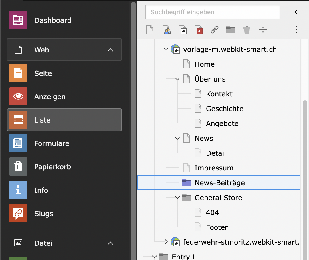 ErweiterungenNewsVersion: Version 12Auf dieser SeiteNews NavigationUnter «Liste» zu Ordner navigieren. Eintrag erstellen Auf «Datensatz erstellen» klicken 1 Überschrift URL verlinkung. Teaser Text eingeben Veröffentlichung festlegen Archivdatum festlegen (optional) Text eingeben Ein oder mehrere Bilder hinzufügen (optional) 2345678