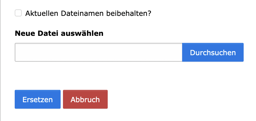 Mit der Funktion Datei ersetzen (4) kann die bestehende Datei einfach durch eine neue Datei ersetzt werden. Die Änderung erscheint umgehend auf Ihrer Webseite. Änderungen auf der betreffenden Seite sind nicht nötig.