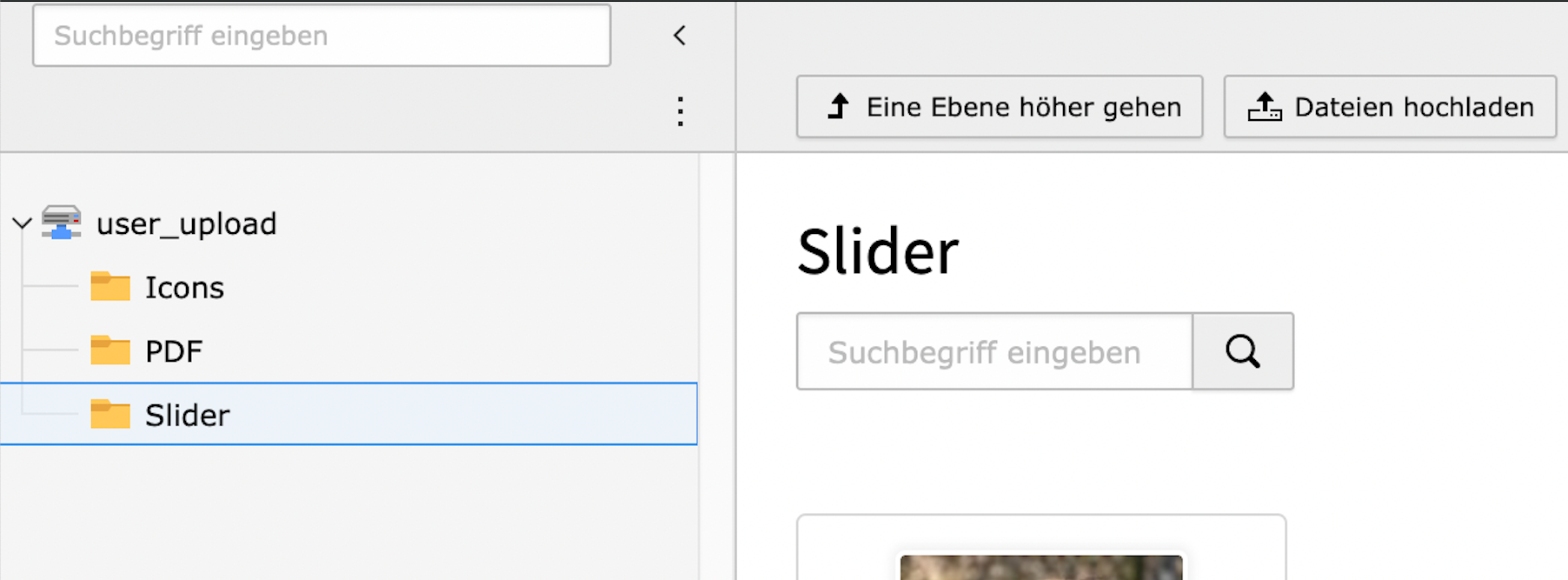 User-Upload: Alle Bilder die direkt in den Content hochgeladen werden, werden in diesem Ordner gespeichert. Dokumente und Bilder: Laden Sie Dokumente und Bilder in den jeweiligen Ordner um Sie anschliessend auf der gewünschten Seite zu verlinken oder einzufügen.