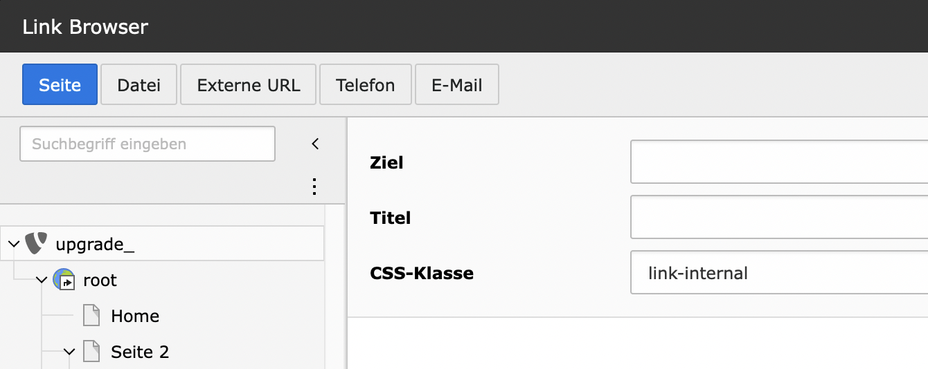 - Externe URL Verlinkt auf externe Inhalte. Der Link wird in einem neuen Fenster geöffnet.