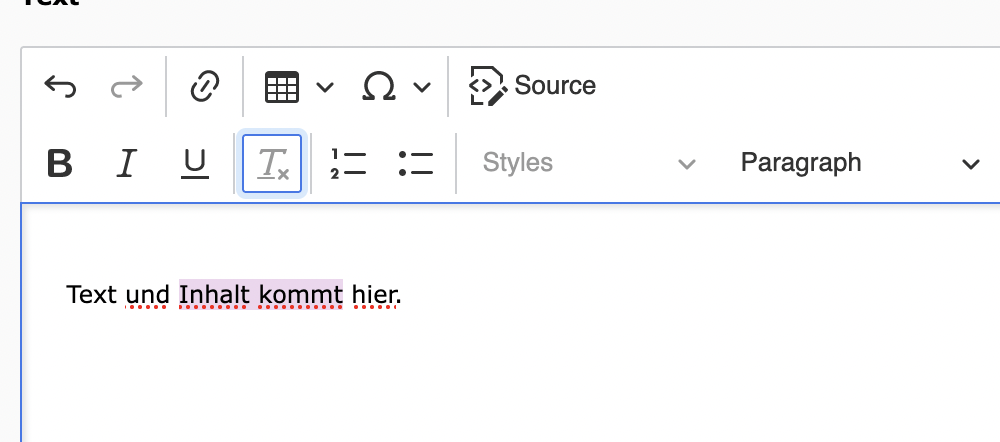 Mit dieser Funktion haben Sie die Möglichkeit unerwünschte Formatierungen, die bspw. durch Kopieren und einsetzen aus dem Office Programm «Word» hinzugefügt wurden, zu löschen. Wählen Sie den Bereich und klicken Sie auf «Formatierung entfernen».