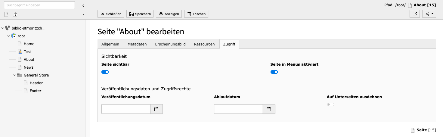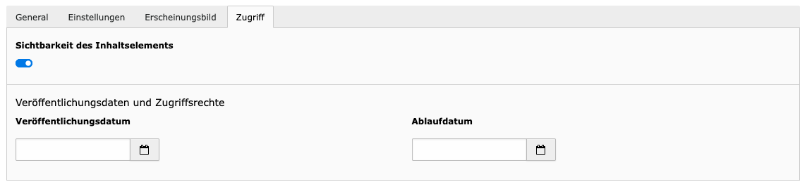 Im Tab «Zugriff» können Sie für Seiten oder Inhaltselemente ein Start- und Enddatum festlegen. Die Veröffentlichung erfolgt dann nur im angegebenen Zeitraum.