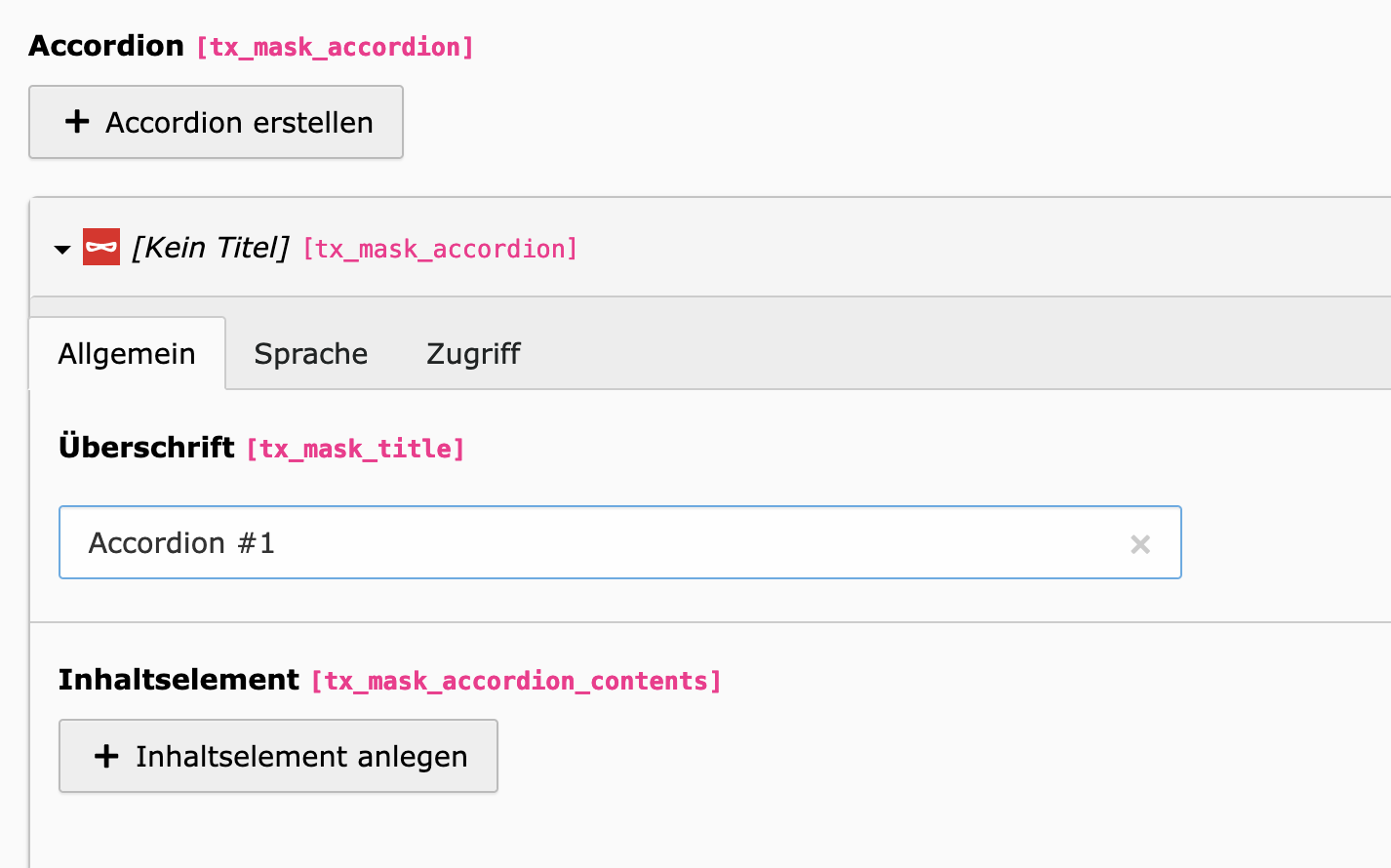 InhalteInhaltselementeAccordionVersion: Version 12Auf dieser SeiteAccordion AllgemeinErmöglicht das ein- und ausblenden von Inhalten in klappbarer Form. Accordion erstellen Überschrift eingeben Inhaltselement anlegen (Reines Textelement) 123 Beispiel