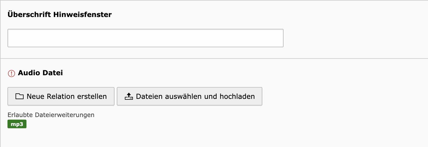 InhalteInhaltselementeAudio PlayerVersion: Version 12Auf dieser SeiteAudio Player Eine ueberschrifft für das Element definieren Datei aus dem Finder oder aus der Dateiliste hochladen. 12 output