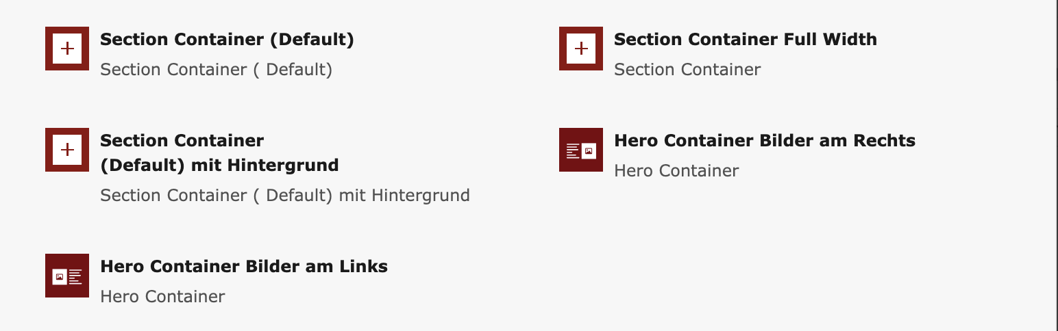 Bei diesem Container können Sie ein Hintergrundbild definieren, welches sich über die komplette Breite erstreckt. Die Elemente werden dann über das Bild gelegt. Hintergrundbilder können im Container unter Einstellungen -> Neue Relation erstellen hinzugefügt werden.