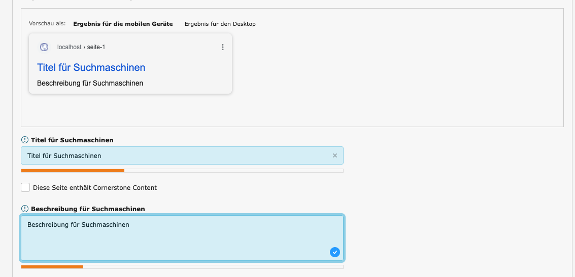 mit der Vorschau können Sie sehen wie Ihre Webseite in den Suchergebnissen angezeigt wird. Sie können die Ansicht von Mobile zu Desktop wechseln mit der hilfe von dem Text oberhalb der Vorschau.
