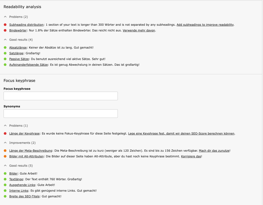 mit hilfe der Lesbarkeitsanalyse Sehen sie wie einfach eine suchmaschine Ihren text lesen kann. Je mehr Punkte grün sind desto besser. Sie erhalten eine Liste von Anforderungen die Sie erfüllen müssen damit Ihre Seite besser gefunden wird.