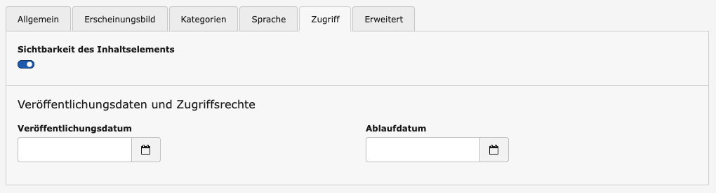 Im Tab «Zugriff» können Sie für Seiten oder Inhaltselemente ein Start- und Enddatum festlegen. Die Veröffentlichung erfolgt dann nur im angegebenen Zeitraum.