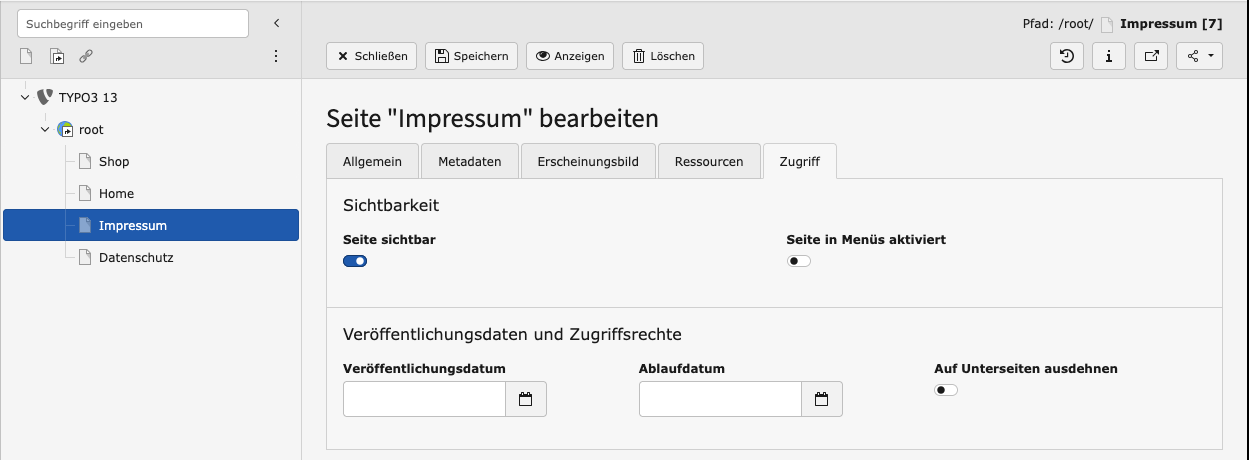 Seite sichtbar: Diese Einstellung regelt, ob die Seite angezeigt wird (resp. aktiviert oder deaktiviert ist)