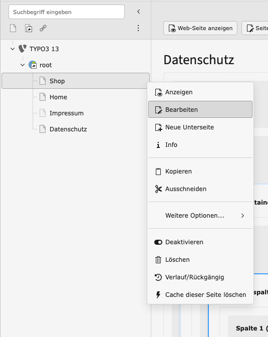 - Rechtsklick auf die Seite, die Sie bearbeiten möchten