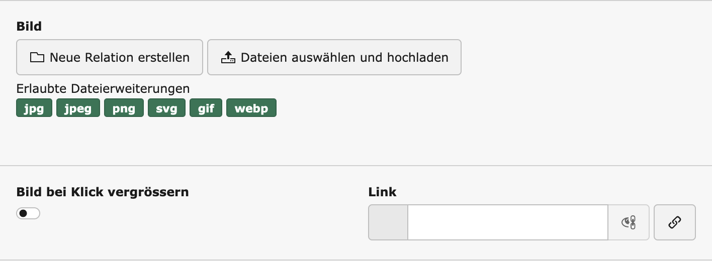 InhalteInhaltselementeBildVersion: Version 13Auf dieser SeiteBild Allgemein Bild anhängen/hochladen Bild bei Klick vergrössern (Vorschau-Modus) Bild verlinken (z.B. auf eine andere Seite) 123 Beispiel