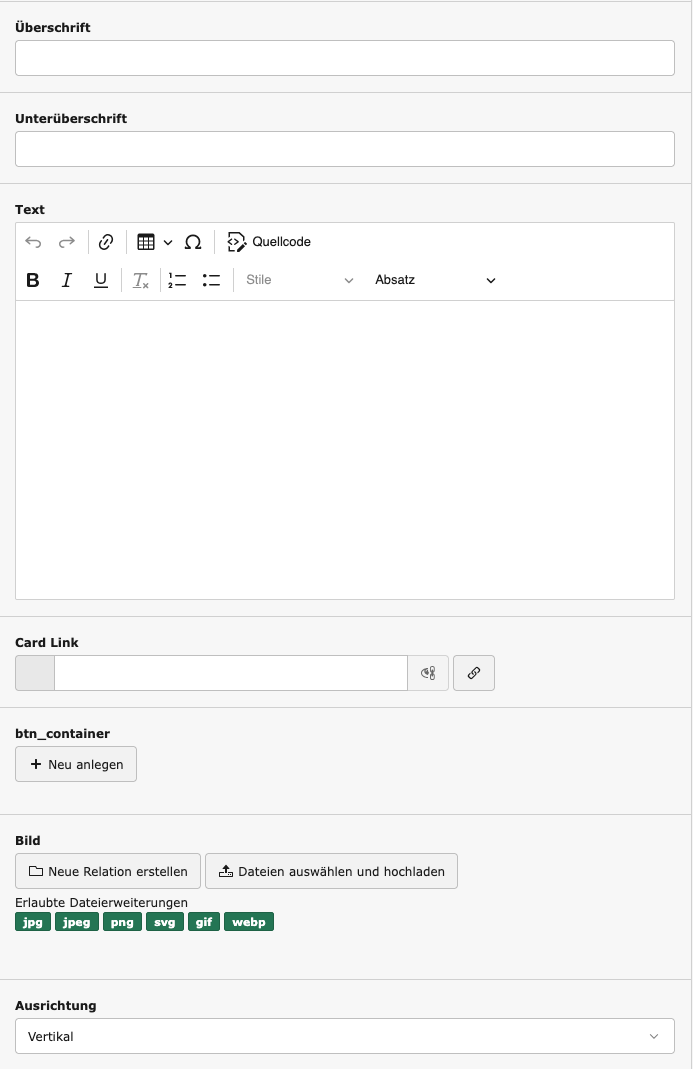 InhalteInhaltselementeCardVersion: Version 13Auf dieser SeiteCard AllgemeinCard mit Inhalt, Bild und Button Inhalt (Überschrift, Unterüberschrift, Text) eingeben Card verlinken Button hinzufügen Bild anhängen/hochladen Ausrichtung des Bildes + Text im Container auswählen 12345 Beispiele mit Einstellungen Ausrichtung: «Vertikal» 1