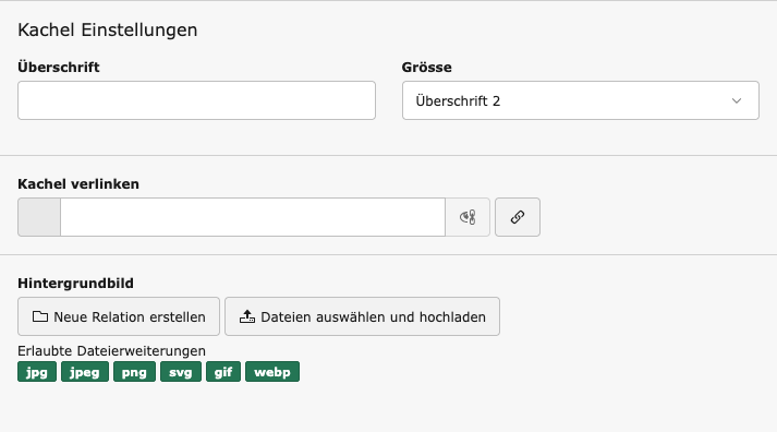 InhalteInhaltselementeKachelVersion: Version 13Auf dieser SeiteKachel AllgemeinKachel mit Bild, Text und Verlinkung. Überschrift eingeben Kachel verlinken Hintergrundbild anhängen/hochladen 123 Beispiel