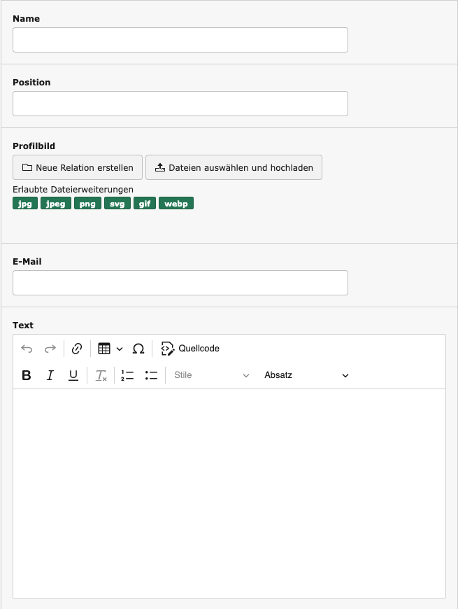 InhalteInhaltselementePersonVersion: Version 13Auf dieser SeitePerson AllgemeinElement mit Personalfoto, Name, Position und Social-Media-Verlinkungen Name Position Profilbild anhängen/hochladen Begleittext zum Bild 1234 Beispiel