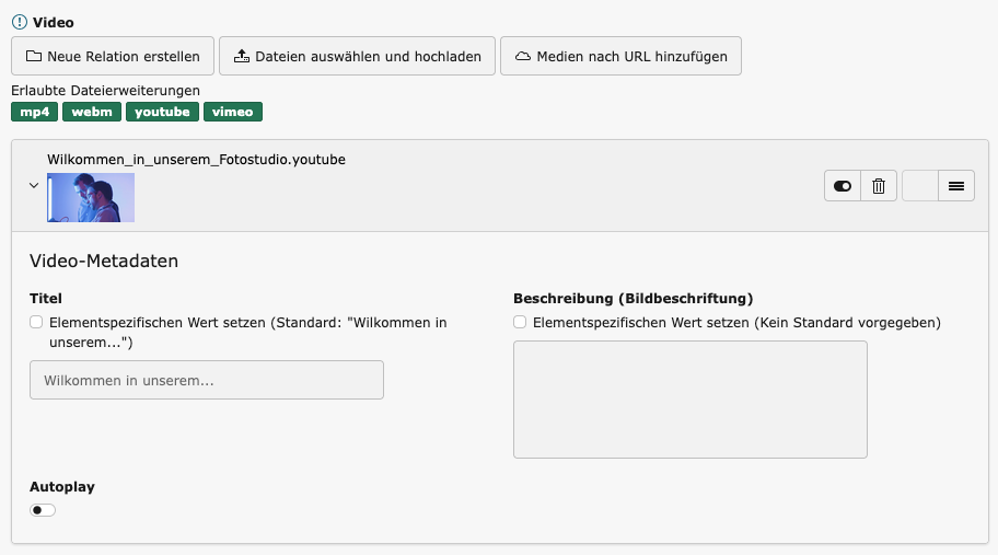 - «Neue Relation erstellen» wählen und die entsprechende Videodatei auswählen