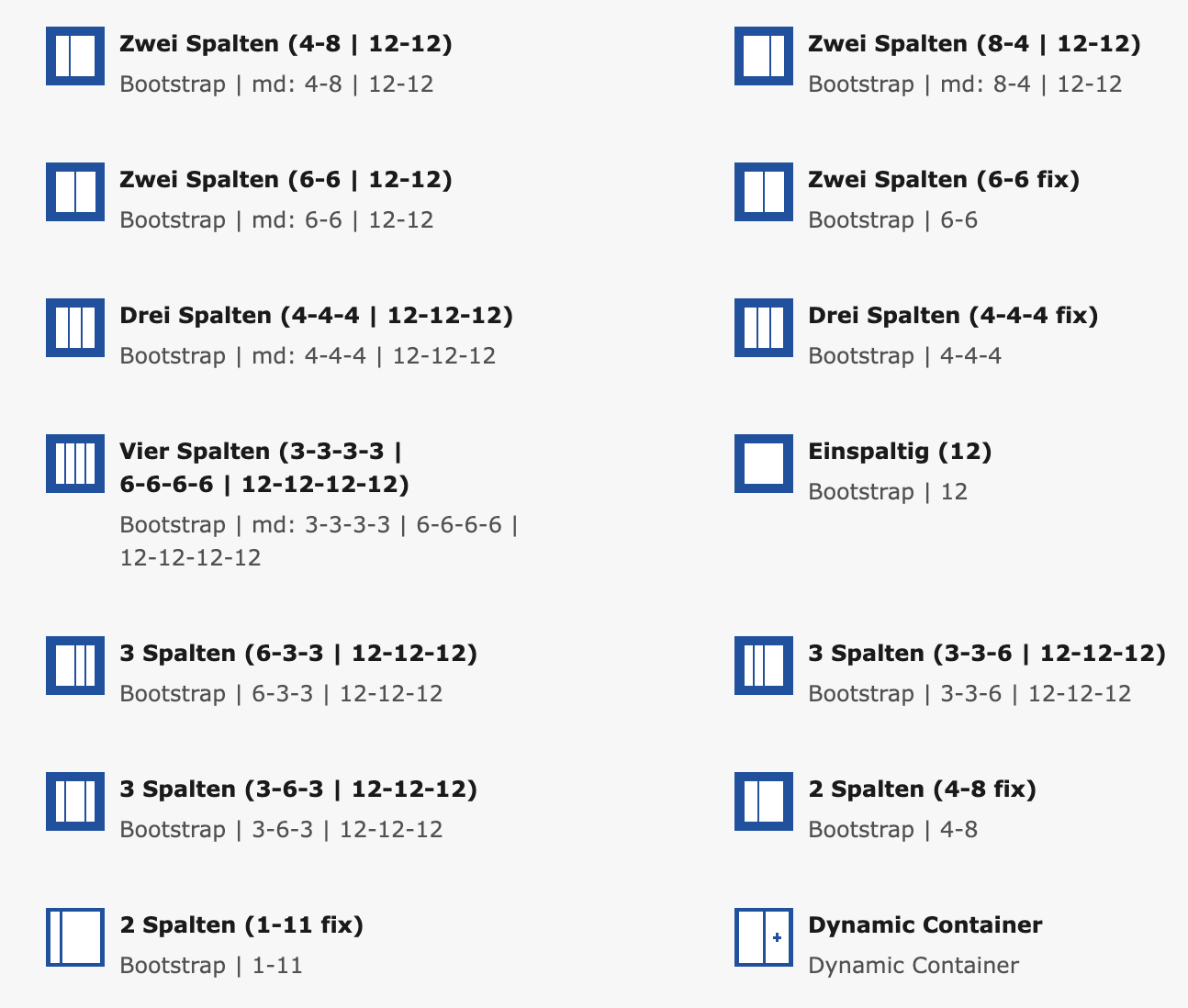 Ein Spaltensystem teilt eine Webseite in Bereiche auf und sorgt für eine flexible Anordnung von Inhalten. Es gibt 12 gleich grosse Spalten. Inhaltselemente können demnach 1 bis 12 Spalten breit sein.
