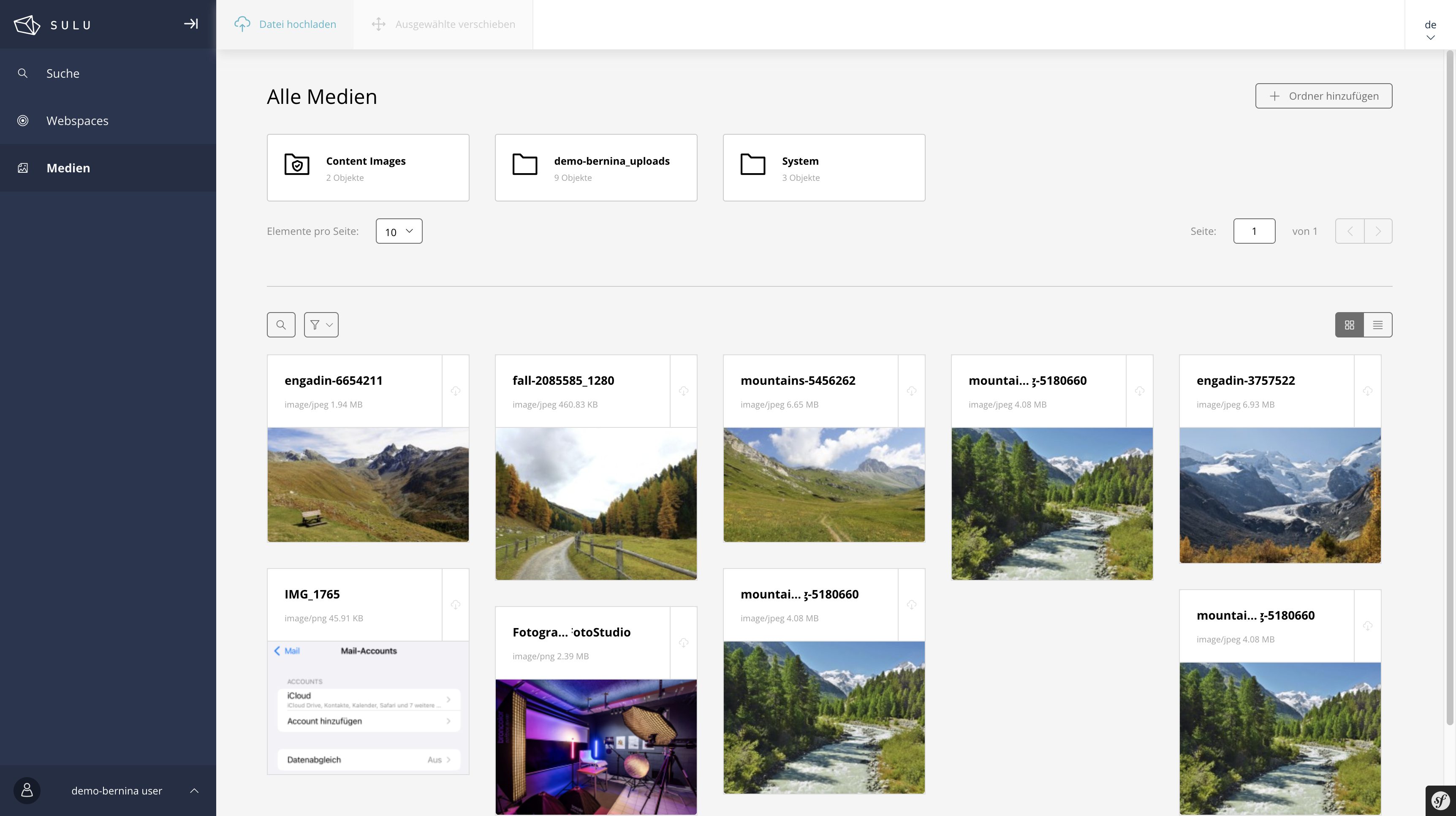 Im Tab «Medien» finden Sie alle Ihre Dateien, welche Sie hochladen. Dabei haben Sie oberhalb der Vorschauen eine Übersicht der Unterordner und darunter eine Galerie von all Ihren Medien.