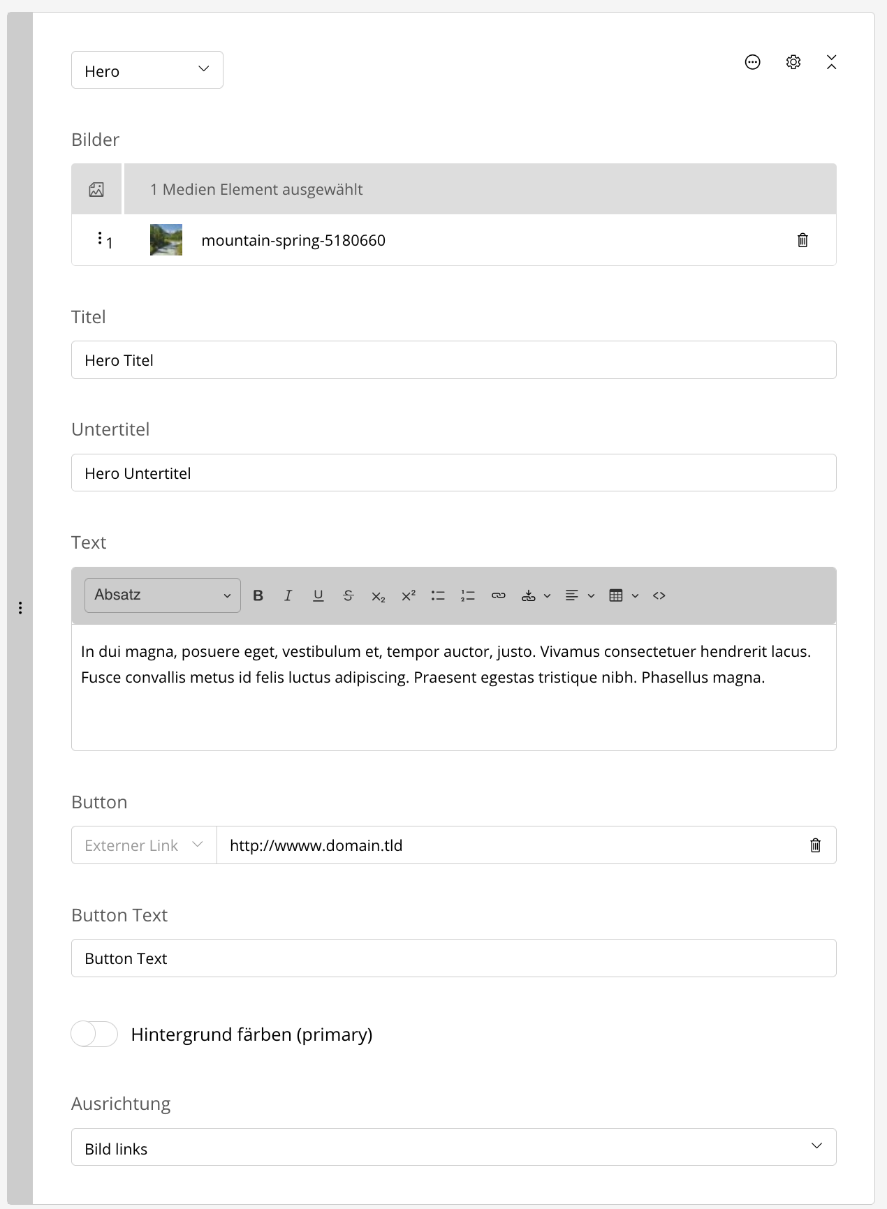 - Eines oder mehrere Bilder (mehrere Bilder werden in einem Slider angezeigt)