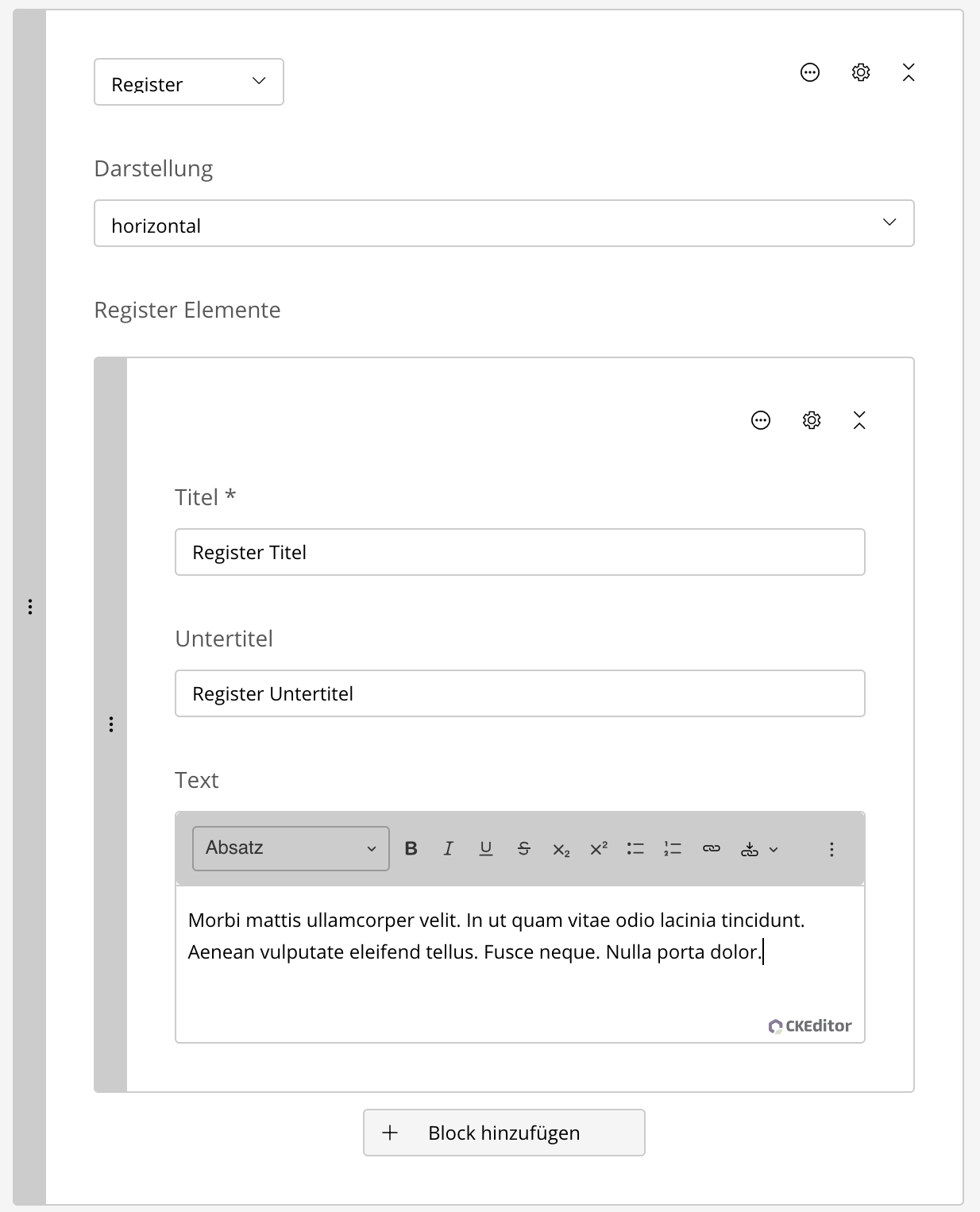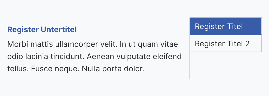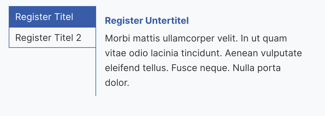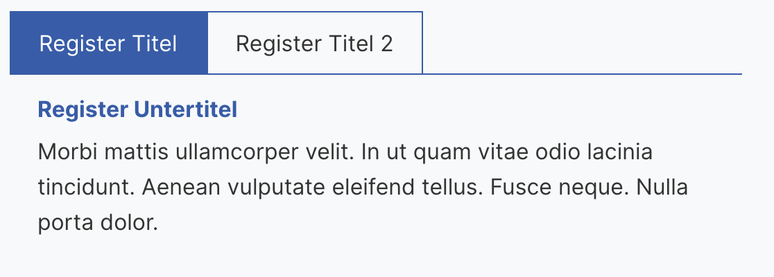 Register sind dem Accordion sehr ähnlich, unterscheiden sich aber darin, dass die Inhalte in Registerkarten organisiert sind. Jede Registerkarte kann einen Titel und einen Inhalt haben. Der Inhalt wird nur angezeigt, wenn die entsprechende Registerkarte ausgewählt ist.