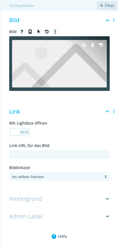 DiviDivi Elemente BildAuf dieser SeiteBild Einstellungen Bild hochladen Bild im Vorschaumodus öffnen (wenn auf das Bild geklickt wird das Bild geklickt wird). Verlinkung festlegen (optional). Zielfenster festlegen (optional).1234beispiel