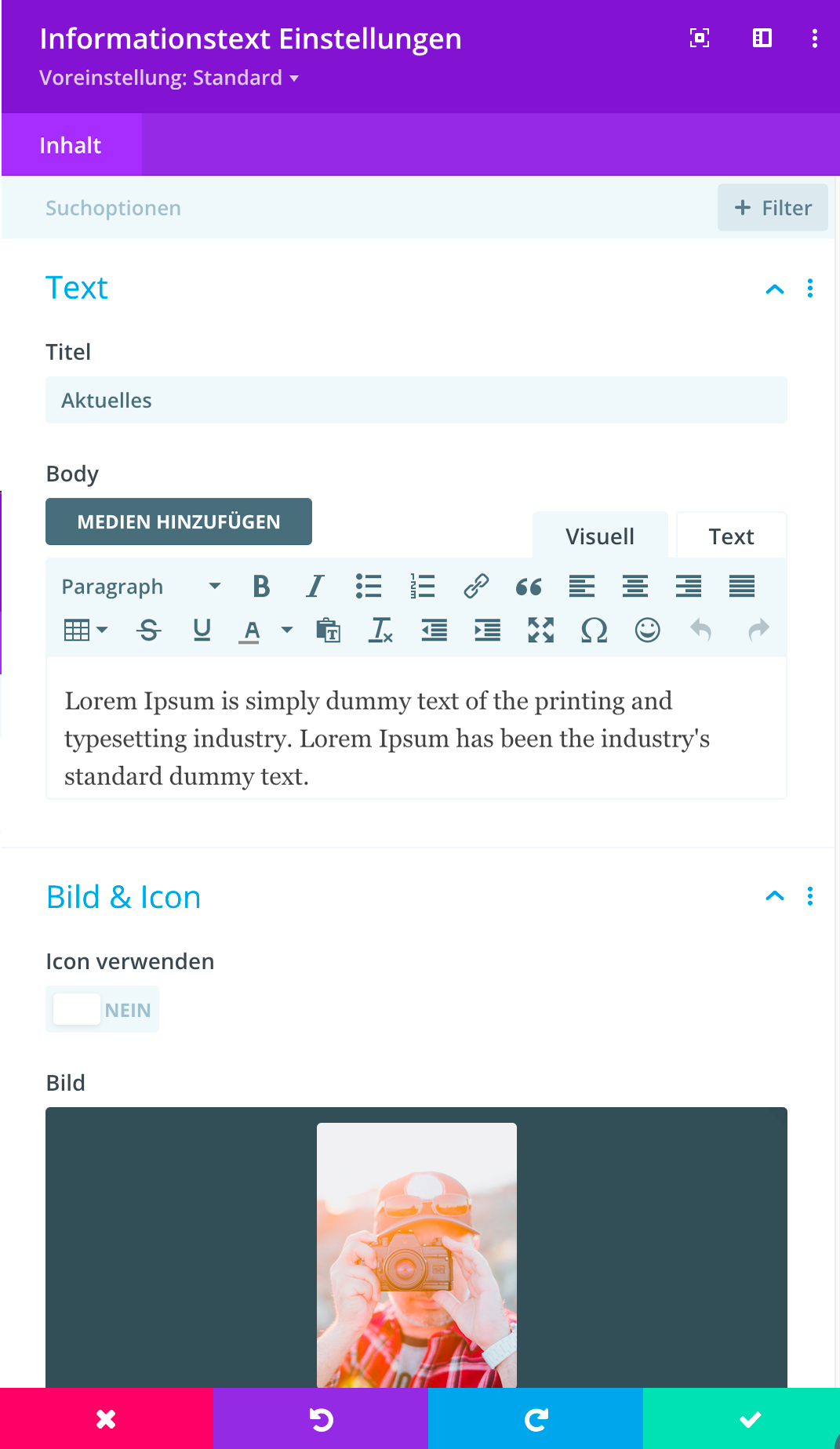DiviDivi Elemente InformationstextAuf dieser SeiteInformationstext Einstellungen Text eingeben. Textstellen markieren und nach Wunsch formatieren/ausrichten (z.B Überschrift, Link, Nummerierung, usw.). Bild hochladen. 123beispiel