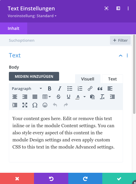 DiviDivi Elemente TextAuf dieser SeiteText Einstellungen Text eingeben. Textstellen markieren und nach Wunsch formatieren/ausrichten (z.B Überschrift, Link, Nummerierung, usw.). 12beispiel