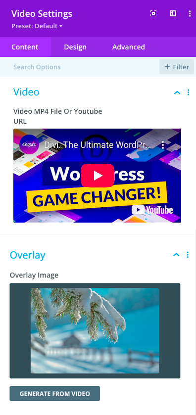 DiviDivi Elemente VideoAuf dieser SeiteBild Einstellungen Video hochladen oder von Youtube einfügen. Vorschaubild hochladen. Vorschaubild aus dem Video erzeugen.1231beispiel