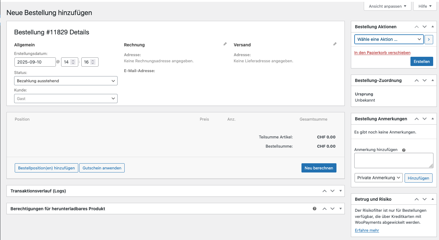 Um eine Bestellung manuell zu erstellen, klicken Sie auf den Button Bestellung hinzufügen.