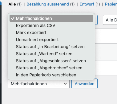 Sie können mehrere Bestellungen gleichzeitig bearbeiten. Wählen Sie dazu die gewünschten Bestellungen mit den Checkboxen (1) aus, wählen Sie eine Aktion unter dem Mehrfachaktionen-Dropdown (2) und klicken Sie auf Anwenden (3).