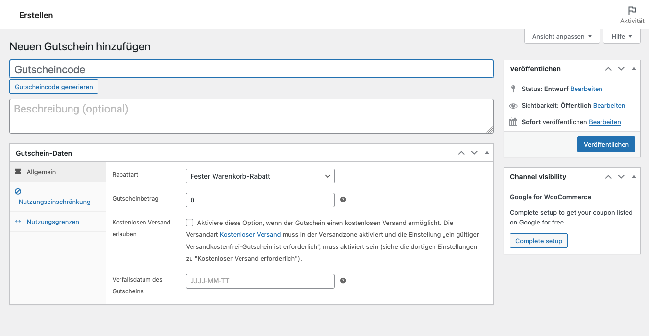 Dies öffnet eine Seite in der Sie den Gutschein konfigurieren können.