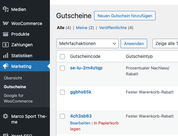 Wenn Sie Gutscheine für Ihren Shop erstellen möchten, können Sie dies unter dem Menüpunkt Marketing tun.