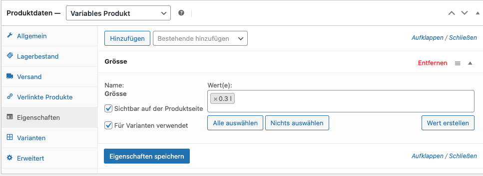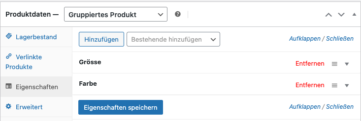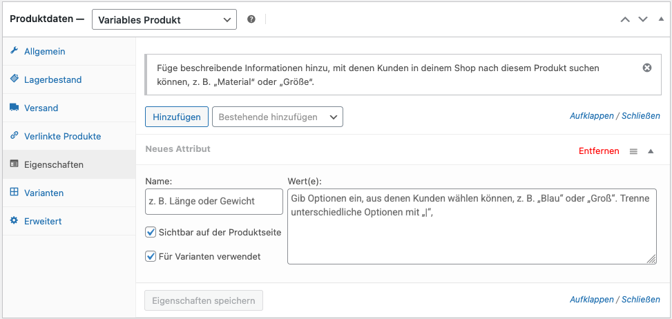 Unter dem Reiter Eigenschaften können Sie die Produktattribute definieren.