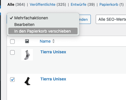 Produkte können gelöscht werden, indem Sie alle Produkte, die Sie löschen möchten, via Checkbox auswählen (1) und anschliessend das Mehrfachaktionen-Dropdown (2) auf "In den Papierkorb verschieben" anwenden.