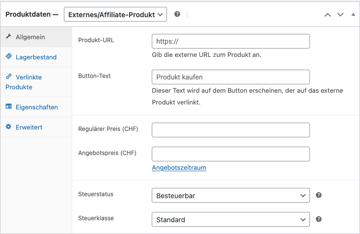 Unter dem Reiter Allgemein können Sie den regulären und den Angebotspreis des Produktes definieren. Ausserdem ist es Ihnen möglich, einen Steuersatz und eine Steuerklasse für das Produkt zu definieren. Hier müssen Sie zusätzlich die Produkt-URL und den Button-Text definieren.