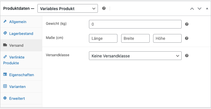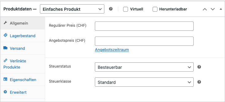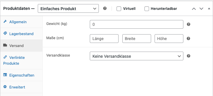 Normal: Ein physisches Produkt, das Sie versenden müssen (wenn Sie keines der beiden Felder neben dem Dropdown-Menü auswählen). Virtuell: Ein Produkt, das keinen Versand benötigt. Wenn Sie dieses Feld aktivieren, werden die Versandoptionen für das Produkt ausgeblendet. Herunterladbar: Erlaubt Zugriff auf eine Datei während des Kaufprozesses.
