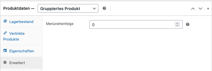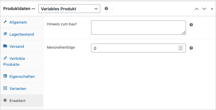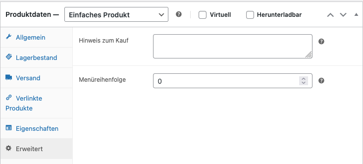 Unter dem Reiter Erweitert können Sie Hinweise zum Kauf und die Menüreihenfolge definieren.