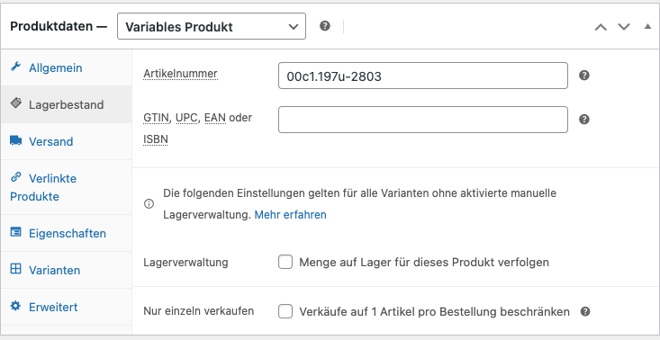 Unter dem Reiter Lagerbestand können Sie folgende Angaben definieren: