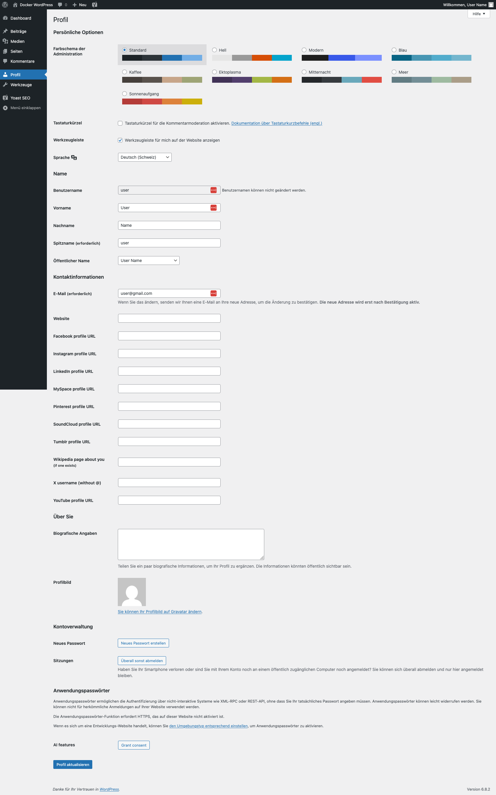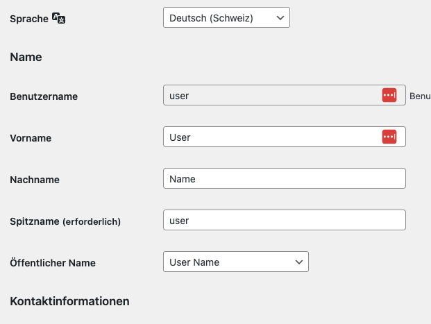 Hier können sie Die Sprache auswählen in der das Backend angezeigt wird. Ausserdem können sie hier Ihren Vornamen , Nachnamen , Spitznamen und ein öffentlichen Name angeben.