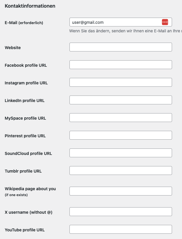 Hier können sie Ihre E-Mail Adresse angeben. Diese wird für Benachrichtigungen und Passwort zurücksetzungen verwendet. nach dem ändern muss diese Via Link bestätigt werden. Ausserdem haben sie Zugriff auf diverse Link felder wo Sie Ihre Sozialen Medien und so weiter angeben können.